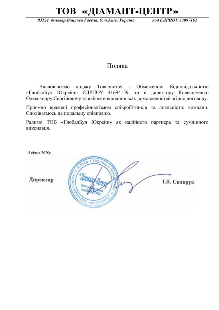 Висловлюємо подяку Товариству з Обмеженою Відповідальністю «ГлобалБуд Юкрейн» ЄДРПОУ41694159, та її директору Колесніченко Олександру Сергійовичу за якісне виконання всіх домовленостей згідно договору.