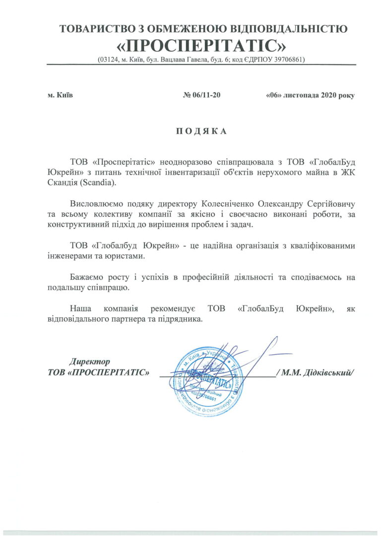 Наша компанія співпрацювала з ТОВ ГлобалБуд Юкрейн з питань технічної інвентаризації об’єктів нерухомого майна в ЖК Скандія (Scandia). Висловлюємо подяку директору Колесніченко Олександру Сергійовичу та всьому колективу компанії за якісно і своєчасно виконані роботи, за конструктивний підхід до вирішення проблем і задач. ТОВ Глобалбуд Юкрейн – це надійна організація з кваліфікованими інженерами та юристами.