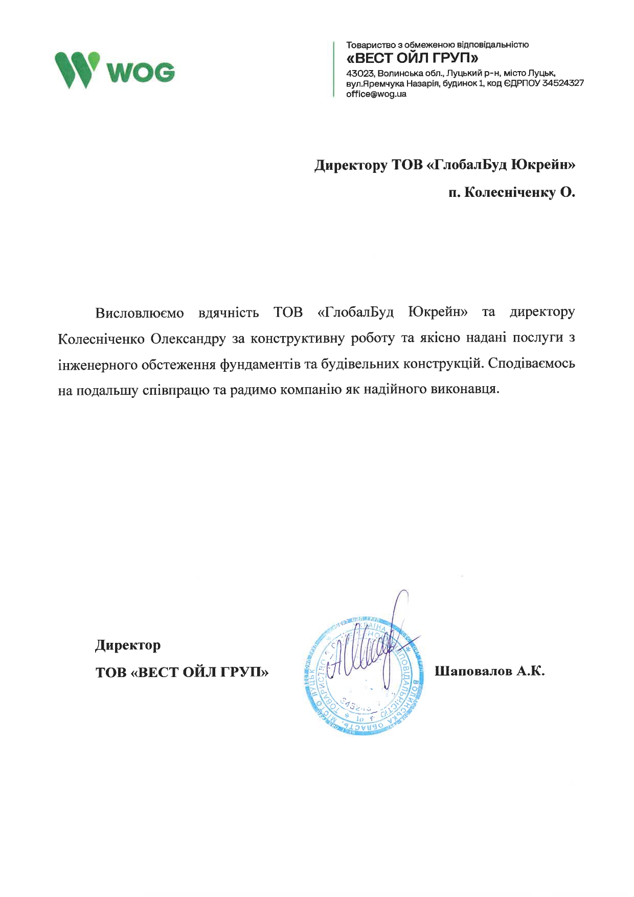 Висловлюємо вдячність ТОВ «ГлобалБуд Юкрейн» та директору Колесніченко Олександру за конструктивну роботу та якісно надані послуги з інженерного обстеження фундаментів та будівельних конструкцій. Сподіваємось на подальшу співпрацю та радимо компанію як надійного виконавця.