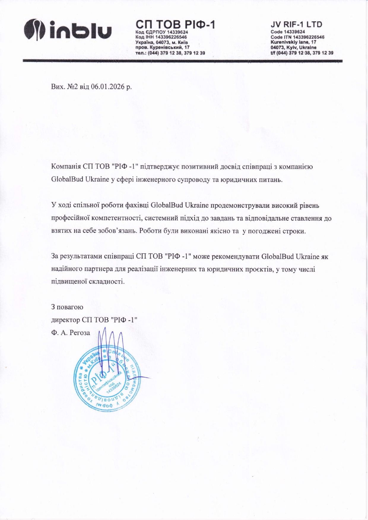 Компанія СП ТОВ “РІФ -1” підтверджує позитивний досвід співпраці з компанією GlobalBud Ukraine у сфері інженерного супроводу та юридичних питань.
